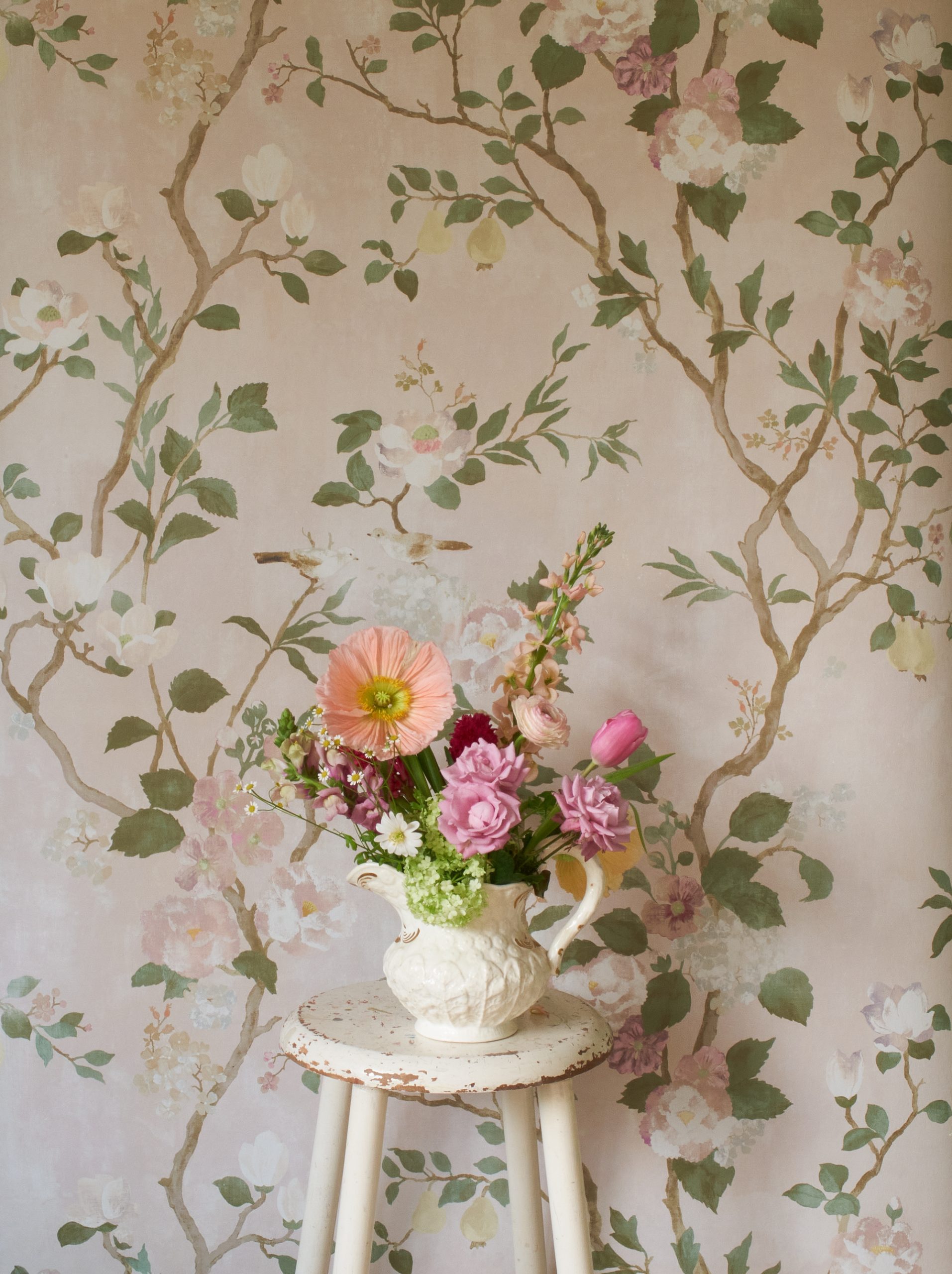 “An enchanting Chinoiserie inspired design centred around the Peony Tree with hollyhocks, pears, apple blossom & Magnolia grandiflora. Two Birds are in quiet conversation, their white underbellies reflecting the luminous petals of the flowers.”